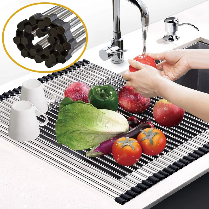 Buen artículo y envío fugaz. vendedor recomendado para Escurridor de vajilla plegable de acero inoxidable, rollo de silicona para cocina, organizador de frutas y verduras, bandeja, utensilios de secado